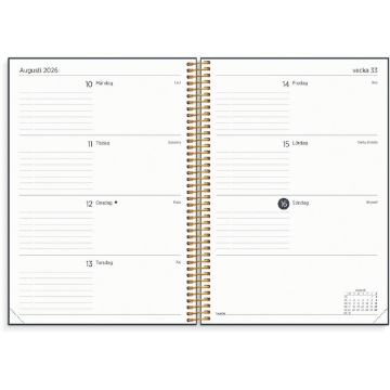 Kalender 2026 från Burde. Format: A5. Layout: Liggande. Vecka/uppslag. Kalendarium: 2025-12-08 - 2027-01-03. Omslag: Kartong med struktur. Spiralbunden. Detaljer: Gummiband. Flyttbara plastmarkörer. Innehåll: Årsöversikter, Årsplaner. Antal sidor: 256. Miljöinformation: FSC®.