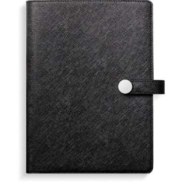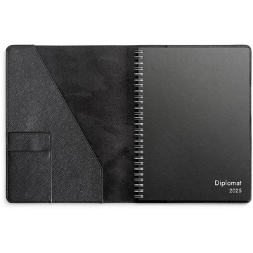 Almanacka Burde 1182 Diplomat Tora Konstläder 2026 Svart A5. Kalender med löst omslag med slejf, två fickor för visitkort eller bankkort samt en större ficka på insidan. Pennhållare. Diplomat monterad inuti omslaget.