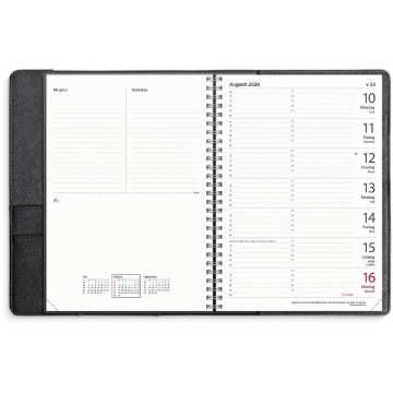 Kalender 2026 från Burde. Format: A5. Layout: Liggande. Vecka/uppslag. Timindelning 8-17. Kalendarium: 2025-12-08 - 2027-01-03. Omslag: Konstläder. Spiralbunden. Detaljer: Flyttbar plastlinjal. Pappersficka. Antal sidor: 160. Miljöinformation: FSC® papper.
