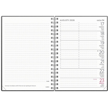 Almanacka Burde 1190 Liten Veckokalender Refill 2026. Kalender 2026 från Burde. Format: A6. Layout: Liggande. Vecka/uppslag. Timindelning 8-17. Kalendarium: 2025-12-08 - 2027-01-03. Omslag: Kartong. Spiralbunden. Innehåll: Inbundet telefonregister, Linjerade vänstersidor, Årsöversikt, Årsplaner. Antal sidor: 144. Miljöinformation: FSC®.