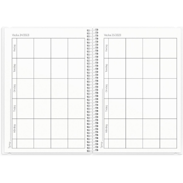 Kalender 25/26 från Burde. Format: A5. Layout: Vecka/uppslag. Stående. Timindelning 8-17. Kalendarium: 2025-06-02 – 2026-08-30. Omslag: PP-plast. Spiralbunden. Detaljer: Gummiband. Flyttbar plastlinjal. Plastficka. Innehåll: Barnförteckning, kontaktlista, kartor, anteckningssidor, schema, elevfrånvaro, veckoschema, årsplaner. Antal sidor: 232. Miljöinformation: FSC®.