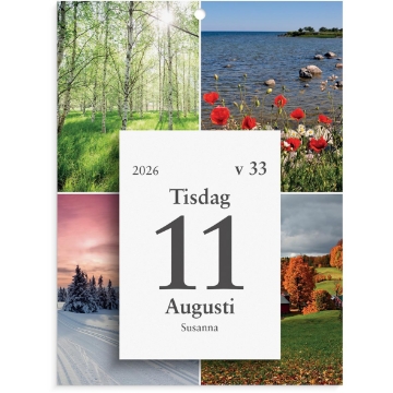Almanacka Burde 1301 Väggplån med dagblock Årstiderna 2026. Följ året genom att riva av blad efter blad. Kalendern har ett väggplån som bakstycke med bilder på de fyra årstiderna och ett dagblock. Dagblocket har en vardag per blad och lördag och söndag på samma blad och är limbundet med klammerbaksida. Kalender 2026 från Burde. Format: 130x175 mm. Layout: Dag/sida. Kalendarium: 2026-01-01 - 2026-12-31. Limbunden. Antal sidor: 318. Miljöinformation: FSC®.