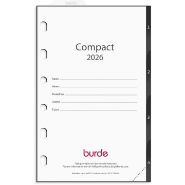 Almanacka Burde 4200 Compact Grundsats 2026. Grundsats till systemkalender Compact. Grundsatsen innehåller hålad kalenderdel (4201) och blankettdel.