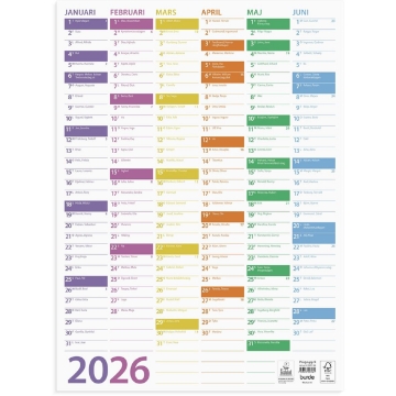 Almanacka Burde 5075 Väggblad Trend 2026. Väggkalender 2026 från Burde. Format: 360x490 mm. Layout: Halvår/sida. Kalendarium: 2026-01-01 - 2026-12-31. Innehåll: Anteckningssidor, Namnsdagar. Antal sidor: 2. Miljöinformation: FSC®. Ecolabel.