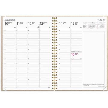 Kalender 2026 från Burde. Format: A5. Layout: Stående. Vecka/uppslag. Timindelning 8-18. Kalendarium: 2025-11-24 - 2027-01-03. Omslag: Återvunnen kartong. Spiralbunden. Detaljer: Gummiband. Pappersficka. Innehåll: Helgdagar internationella, Årsöversikter, Årsplaner. Antal sidor: 128. Miljöinformation: FSC®. Omslag i återvunnen kartong.