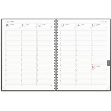 Kalender 2026 från Burde. Format: 192x260 mm. Layout: Stående. Vecka/uppslag. Kvartsindelning 8-19. Kalendarium: 2025-12-29 - 2027-01-03. Omslag: Konstläder. Spiralbunden. Innehåll: Helgdagar internationella, Årsöversikter, Årsplaner. Antal sidor: 368. Miljöinformation: FSC® papper.