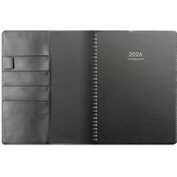 Almanacka Burde 5801 Veckojournal Konstläder Med Slejf 2026. Kalender med löst omslag med slejf, fyra kreditkortsfickor, en större ficka och pennhållare. Inlagan är stor och ger riktigt bra översikt över veckan och har kvartsindelningar för praktisk tidsbokning.