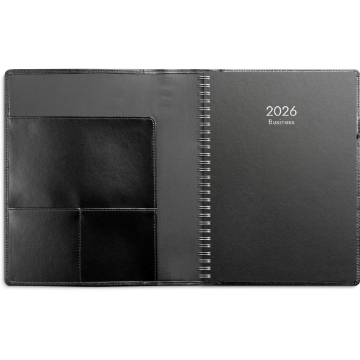 Almanacka Burde 5940 Business Skinn 2026 Svart A5. Kalender med löst omslag med två kreditkortsfickor, en större ficka och pennhållare. Att ha flyt på jobbet handlar till stor del om konsten att planera. Det här är kalendern för dig som vet att arbetsdagen lätt blir hektiskt och snabbt fylls på med möten och uppgifter. När du vet vad som väntar varje dag blir du mer effektiv och chansen är större att du når dina karriärmål. Kalender 2026 från Burde. Format: A5. Layout: Stående. Vecka/uppslag. Kalendarium: 2025-11-24 - 2027-01-03. Omslag: Skinn. Spiralbunden. Innehåll: Helgdagar internationella, Årsöversikter, Årsplaner. Antal sidor: 144. Miljöinformation: FSC® papper.