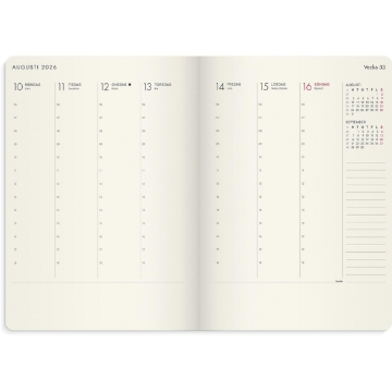 Kalender 2026 från Burde. Format: A5. Layout: Stående. Vecka/uppslag. Timindelning 6-18. Kalendarium: 2025-12-22 - 2027-01-03. Omslag: Konstläder. Inbunden. Detaljer: Gummiband. Märkband. Pappersficka. Innehåll: Anteckningssidor linjerade, Anteckningssidor olinjerade, Anteckningssidor rutiga, Årsplaner. Antal sidor: 176. Miljöinformation: FSC® papper.