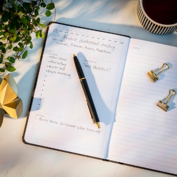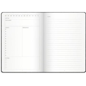 Almanacka Burde 7434 Meeting journal. Anteckningsbok framtagen för möten. Skriv ner agendan och vad som behöver förberedas. 3st anteckningssidor finns för varje möte. Plats för 44 möten.
