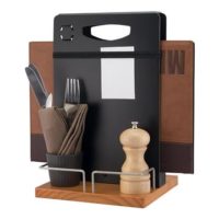 Håll ordning med Securit bordscaddy som passar för både inomhus- och utomhusbruk. En träbas och metallram. Plats för din menyhållare och extra utrymme för bestick och kryddor. Den dubbelsidiga griffeltavlan med handtag kan användas för att anpassa varje bordscaddy. Alternativt kan du sätta in en bild eller meny under det elastiska bandet. En Securit original vit kritmarkör ingår.