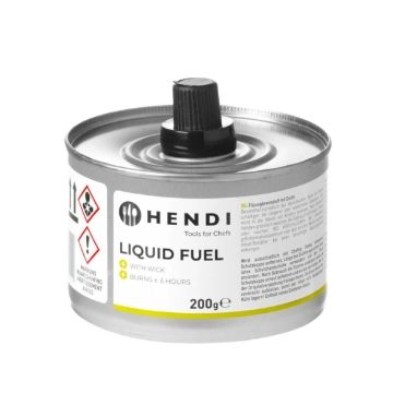 Bränslepatron Hendi Med Veke Brinntid ca 6 timmar. Brinner utan sot eller lukt. Detta bränsle tillverkas av ren dietylenglykol (DEG), som också används som antifrys i radiatorer. Genom att använda en veke kan DEG förångas och brännas trots sin relativt höga flampunk på 143°C. Brinntiden för en burk är omvänt proportionell mot intensiteten av dess låga, vilket kan justeras genom att ändra den exponerade höjden på veken. Brinntid: ± 6 timmar för 270 gram burkar.