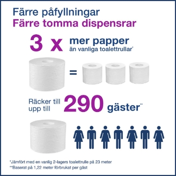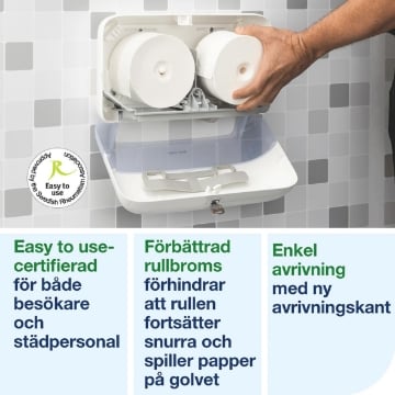 Tork OptiServe Coreless är ett system med hög kapacitet för toalettpapper utan hylsa som passar för anläggningar där effektivitet, hållbarhet och en utmärkt upplevelse är av största vikt. Hög kapacitet, minskad förvaringsplats och en design som är Easy to use-certifierad gör det till ett bättre alternativ än vanligt toalettpapper och jumborullar. Denna dispenser för två rullar toalettpapper är del av ett brett sortiment som möter behoven i olika toalettutrymmen, så att samma kompakta refiller för toalettpapper kan användas i hela anläggningen. Jämfört med vanligt toalettpapper rymmer Tork OptiServe® Coreless rullar 3 gånger mer papper eftersom de varken har hylsa eller omslag, vilket innebär mindre avfall.