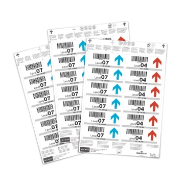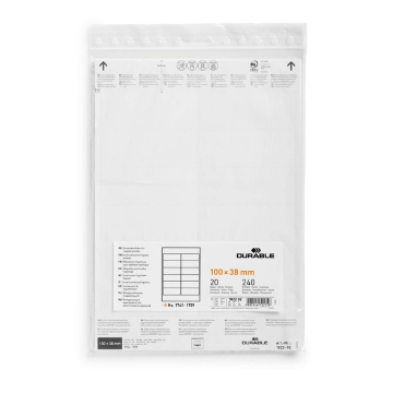 Etikettark Till Etikethållare Vit 100x38 mm. Tydlig och översiktlig märkning av hyllor, skåp , dörrar, containrar och andra utrymmen förbättrar och effektiviserar arbetsprocessen på lager och i produktionsanläggningar. Etiketter passande till DURABLE etiketthållare: A4-ark med etiketter som är lätta att riva isär. För snygga etiketter använd mallarna i gratisprogrammet DURAPRINT® på www.duraprint.se. Designa och skriv sedan ut i laser och inkjetskrivare samt kopiatorer. Dessa etikettark passar logistikfickor med måtten113x53 mm (L x H) och innehåller 20 ark med 12 etiketter per ark.
