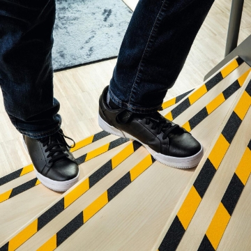 Halkskyddstejp Duraline Grip Color Gul/Svart 25 mm avsedd för inomhusbruk eller i skyddade lägen utomhus där det finns en halkrisk. Det kan vara hala golv eller trappsteg, stegar, sluttande ramper, pedaler och stegavsatser på maskiner och fordon. Det här är en 25 mm smal, varselfärgad självhäftande tejp med medelgrov kornstorlek som ger en yta med bra grepp och friktion.