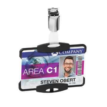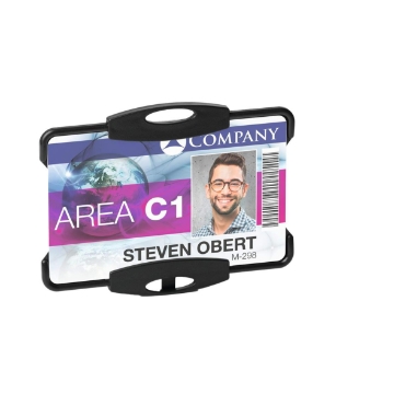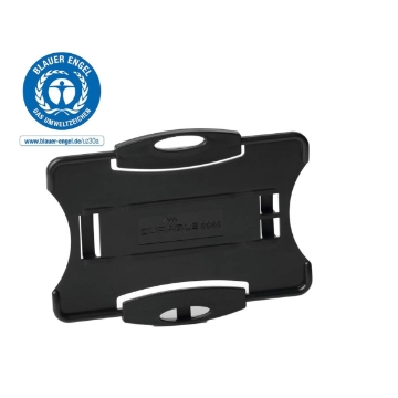 Korthållare Durable ECO För 1 Kort Svart är en miljövänlig lösning för att förvara och visa upp ett ID-kort eller passerkort. Tillverkad av minst 80 % återvunnet material och miljömärkt med Blue Angel, är hållaren både hållbar och miljömedveten. Den har en öppen front för enkel åtkomst och kan användas i både stående och liggande format. Korthållaren har en inre bredd på 87 mm och en höjd på 54 mm, och fastställs säkert med hålning. Den är kompatibel med klämma, textilhalsband eller kedja. Perfekt för att hålla ett kort, som enkelt kan bytas ut vid behov. Yttermåtten är 92 mm i bredd och 70 mm i höjd.