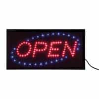 Låt alla veta att din bar, butik eller restaurang är öppen med Securit Open LED-skylt. Placera den färgstarka skylten i ett fönster eller på en vägg. Den har två färgblinkande LED-lampor. Levereras med en 220v AC-adapter och en 130 centimeter lång strömkabel. Mycket synlig både dag- och nattetid.