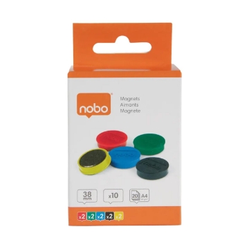 Magnet Nobo 38 mm Sort.färg. Runda magneter är det perfekta verktyget för brainstorming-sessioner, när man vill visa och visualisera idéer på magnetiska whiteboards och glastavlor. De passar även utmärkt att använda som kylskåpsmagneter för att fästa påminnelser och viktiga meddelanden på ett snyggt sätt hemma. Dessa färgade magneter håller 20 x 80 g/m² A4-ark säkert på plats och är 38 mm i diameter. Magnetstyrka 2,5 kg, förpackning med 10 svarta magneter.