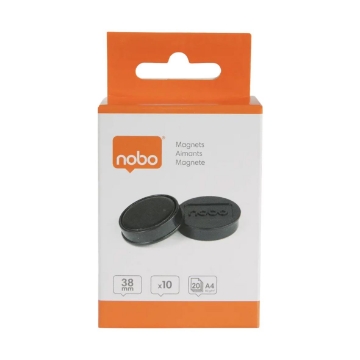 Magnet Nobo 38 mm Svart. Runda magneter är det perfekta verktyget för brainstorming-sessioner, när man vill visa och visualisera idéer på magnetiska whiteboards och glastavlor. De passar även utmärkt att använda som kylskåpsmagneter för att fästa påminnelser och viktiga meddelanden på ett snyggt sätt hemma. Dessa färgade magneter håller 20 x 80 g/m² A4-ark säkert på plats och är 38 mm i diameter. Magnetstyrka 2,5 kg, förpackning med 10 svarta magneter. • 38 mm runda whiteboard-magneter • Perfekt verktyg för att visa och visualisera idéer under brainstorming-sessioner. • Perfekt som kylskåpsmagneter för att fästa påminnelser och viktiga meddelanden på ett snyggt sätt hemma. • Färgad magnet håller 20 x 80gsm A4-ark säkert på plats. • Magnetstyrka 2,5 kg • Förpackning med 10 svarta magneter.