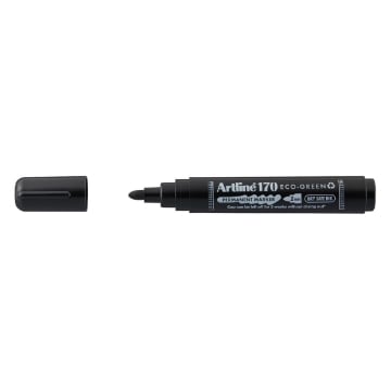 Märkpenna Artline 170 ECO Perm Konisk Svart. Permanent märkpenna med rund spets (2 mm). Snabbtorkande, vattenfast tusch i plasthylsa. Alkoholbaserad och helt fri från xylen. Utrustad med Dry Safe-funktion, vilket gör att den kan ligga utan lock i upp till två veckor utan att torka. Tillverkad av återvunnen plast – ett miljövänligt val!