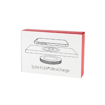 Mobilladdare Sun-Flex UltraCharge. SUN-FLEX® UltraCharge är en innovativ trådlös långdistansladdare som gör det möjligt att ladda Qi-kompatibla enheter genom ytor med en tjocklek på 12–30 mm. Den fungerar med alla Qi-enheter, såsom mobiltelefoner, hörlurar och smartklockor.