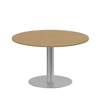Större pelarbord med bordsskiva i ek och stativ i silver. Höjd 720 mm och diameter 1200 mm. Bordet passar utmärkt i cafémiljöer och finns i flera utföranden.