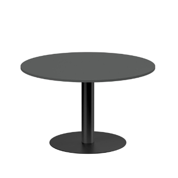 Större pelarbord med bordsskiva i mörkgrå och stativ i svart. Höjd 720 mm och diameter 1200 mm. Bordet passar utmärkt i cafémiljöer och finns i flera utföranden.