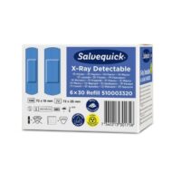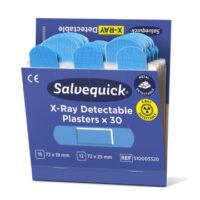 Plåster Salveqvick X-Ray Detecteble Blå. Salvequick Blue X-Ray Detectable Plåster, speciellt utformade för användning inom livsmedelsindustrin. Plåstren är både röntgen- och metalldetekterbara. Den blå färgen gör att plåstren är lätta att upptäcka visuellt. Plåstren är vattentäta och allergitestade. De är lätta att applicera, flexibla och smidiga att använda. Passar till Salvequick plåsterautomat. Varje refill innehåller 30 plåster (18 st 72x19 mm och 12 st 72x25 mm). 6 refiller/ask.