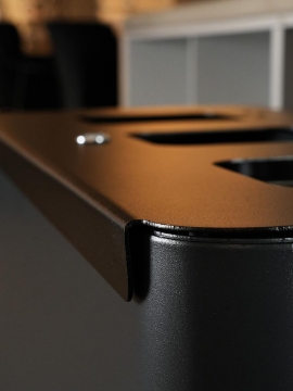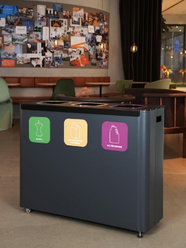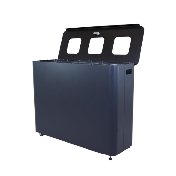 Sorteringsstation 3 x 60 liter. Star Station är en robust sorteringsstation med låsbart lock med tre fraktionsöppningar. Säckhållare för vardera fraktion. Lockets gångjärn håller det vertikalt öppet vid tömning. För enkel förflyttning finns hjul och handtag på ena kortsidan, samt justerbara tassar på andra sidan. Tillverkad av 1 mm galvaniserat och pulverlackerat stål. Star Station kan utrustas med tillbehör: insatser i plast (30 l), insatser galvaniserat stål (48 l), dekaler för sorteringsfraktionerna, lock för enskild fraktion