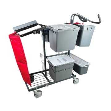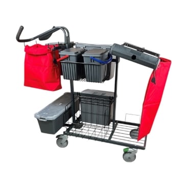 Städvagn AO Maxi Gen2. Det här är en stor städvagn för professionell städning som har utrustats med anpassade funktioner för städning med impregnerat material på stora objekt. Vagnen har generöst med utrymme för påfyllningsmaterial, moppar och dukar. Användaren får bra ergonomi då vagnen är utrustad med reglerbart handtag. Ergonomisk mopplåda(bara att trycka fast mopparna direkt mot kardborren) för 60cm moppar (15-20st). Det finns också två 25L backar med snabblock, två redskapshållare och en kassett för rullen med 30L soppåsar. På vagnen finns också en 12L hink med lock för tex 30cm moppar och , två 6L hinkar med flipplock och en stor tvättpåse. Vagnen är svensktillverkad. Mått120x60x112cm