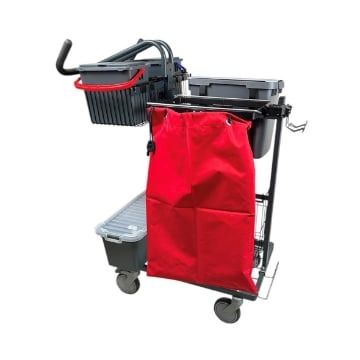 På vagnen finns en 35L tvättpåse , reglerbart handtag och plats för två skaft med stativ. Med på vagnen finns även två 6L hinkar med flipplock för dukar och redskap. Så finns det också en funktionell hållare för sopsetet. Proffshjulen ( 125mm) som får vagnen att vara lättmanövrerad och tystgående kommer inte att göra någon besviken.