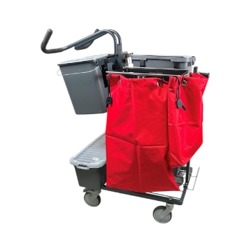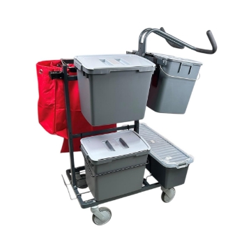 På vagnen finns en 35L tvättpåse för moppar och en 23L tvättpåse för dukar. Reglerbart handtag och plats för två skaft med stativ. Med på vagnen finns även två 12L hinkar med snabblock för dukar,redskap och korta moppar. Proffshjulen ( 125mm) som får vagnen att vara lättmanövrerad och tystgående kommer inte att göra någon besviken.