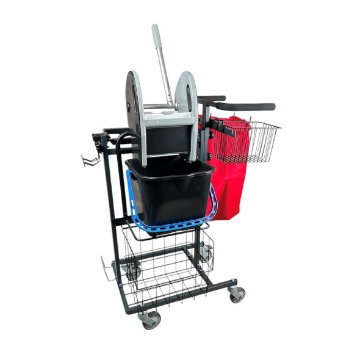 Det här är en liten kompakt städvagn som har utrustats med kraftig moppressutrustning för att preparera mopparna ute på objektet. Förutom det funktionella pressystemet som är lättillgängligt så finns det en 23L tvättpåse. Handtaget går att ställa in i högt eller lågt läge för att fungera för alla användare. Det finns plats för två skaft med stativ. Det är plats för en 125L sopsäck och extra stor trådkorg för påfyllningsmaterial. Så finns det också en funktionell hållare för sopsetet. Proffshjulen som får vagnen att vara lättmanövrerad och tystgående kommer inte att göra någon besviken.