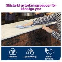 Tork Reflex® Avtorkningspapper är ett 1-lagerspapper vars styrka och höga absorptionsförmåga gör att det passar perfekt för både avtorkning och för att torka händerna.