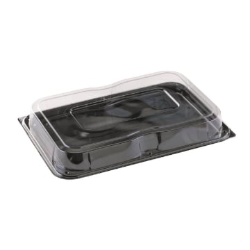 Uppläggningsfat Med Kupollock Svart 54x37x8 cm sampackat med kupollock. Mått inkl lock 54x37x8 cm. Tillverkat av återvunnen plast ( rPet). Snyggt och praktiskt uppläggningsfat som passar perfekt för catering och uppläggningar av en mängd olika produkter.