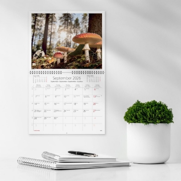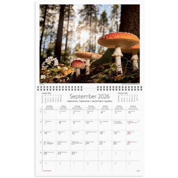Väggkalender Burde 1735 Vår vackra skog 2026. Väggkalender med tolv bilder från svenska skogar och dess djurliv, den är femspråkig (svenska, engelska, tyska, spanska och finska) och har svenska namnsdagar.