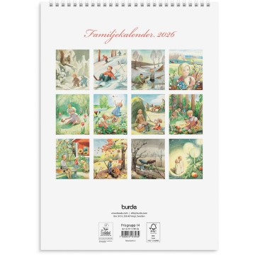 Familjekalender 2026 från Burde. Format: A4. Layout: Månad/blad. Kalendarium: 2026-01-01 - 2026-12-31. Spiralbunden. Innehåll: 4 kolumner. Antal sidor: 12. Miljöinformation: FSC®. Ecolabel.