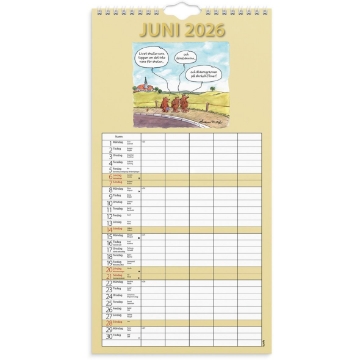 Väggkalender Burde 1758 Familjekalender Rolig 2026. Familjekalender 2026 från Burde. Format: 220x430 mm. Layout: Månad/blad. Kalendarium: 2026-01-01 - 2026-12-31. Spiralbunden. Detaljer: Pappersficka. Innehåll: 5 kolumner. Antal sidor: 12. Miljöinformation: FSC®.
