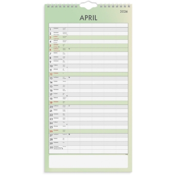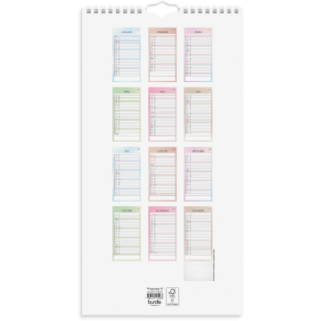 Väggkalender Burde 1792 Familj Tydlig 2026. En familjekalender som ska ge extra stöd och tydlighet i er planering. Ett månadsuppslag med fem kolumner och ett enkelt formspråk som inte tar bort fokuset från syftet med kalendern - att hjälpa till att planera och förbereda sig för dagen, veckan och månaden. Väggkalendern ger trygghet och en hjälpande hand i vardagen och ni kan organisera, planera och genomföra händelser på samma sätt, år efter år. De tolv månaderna har sex återkommande färger i designen. Helgdagar markeras med samma färg som månaden, dagarna skiljs åt med tydliga skuggningar och det finns en ruta för anteckningar längst ned på varje sida.