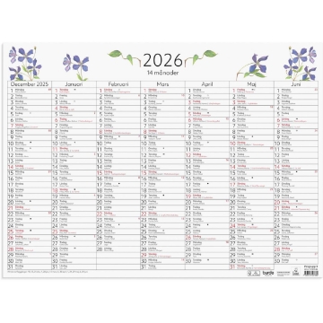 Väggkalender Burde 5076 Väggblad 14-Månaders 2026 490x360mm. Kalender som väggblad. 14 månader, december från föregående år och januari för nästkommande år. Sju månader per sida. Namnsdagar och plats för anteckningar.
