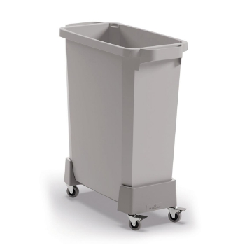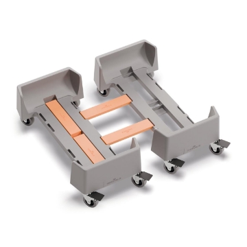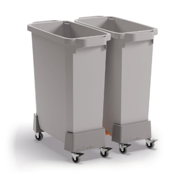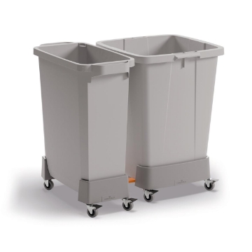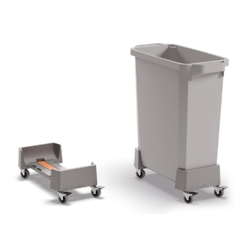 Rullvagn av återvunnen plast för en DURABIN 60 liters tunna. Upp till 4 st kan kopplas ihop. • Upp till 4 vagnar - för både 60 och 90 liters tunnor, kan kopplas ihop med hjälp av de medföljande och integrerade kopplingarna. • Själva bottenplattan är tillverkad av 100% återvunnen polypropylenplast, vilket gör att produkten inkl hjul totalt sett är tillverkad av 50% återvunnet material. • Tål fukt, vilket underlättar vid rengöring. Länkhjulen har en diameter på 50 mm och två av dem har broms. • Belastningsbar upp till 80 kg • Mått inkl. hjul: 240 x 165 x 495 mm (BxHxD)