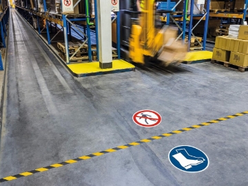 Självhäftande stor golvdekal "Använd skyddskor" upplyser tydligt besökare och personal att följa rekomendationerna för att minska risken för skador. Fäster på rena och torra betonggolv. Slitstark och tålig med halkskyddsgrad R9 i enlighet med DIN 51130. Skyltarna uppfyller kraven i ISO 7010.