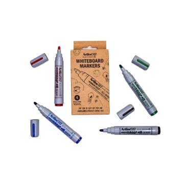 Whiteboardpenna Artline 517 ECO-GREEN Konisk 4 Färger. Whiteboardpenna med rund spets och ca 3,0 mm linjebredd. Pennan har en plasthylsa tillverkad av återvunnen plast och innehåller en alkoholbaserad pigmenttusch utan xylén. Dry Safe-funktionen gör att pennan kan lämnas utan huv i upp till 48 timmar utan att torka. Tillverkad av återvunnen konsumentplast och certifierad med Eco Mark (24112014). Förpackningen innehåller 4 pennor: 1 svart, 1 blå, 1 röd och 1 grön.