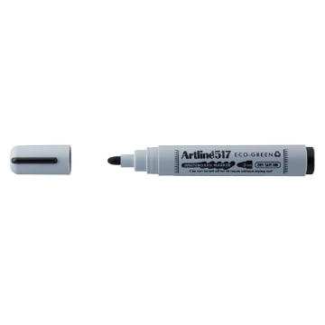 Whiteboardpenna Artline 517 ECO-GREEN Konisk Svart. Whiteboard-penna med koniska spets 3 mm skrivbredd. Plasthylsa i återvunnen plast, alkoholbaserat pigmenttusch utan Xylen, Dry Safe-funktion vilket betyder att den vara utan huv i 48 timmar.Tillverkad av återvunnen plast. Miljömärk med Eco Mark (24112014)
