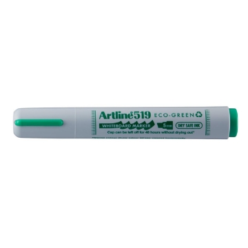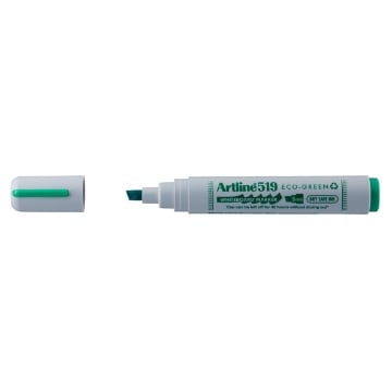 Whiteboardpenna Artline 519 ECO-GREEN Sneddskuren Grön. Whiteboard-penna med skuren spets och 2-5 mm skrivbredd. Plasthylsa i återvunnen plast, alkoholbaserat pigmenttusch utan Xylen, Dry Safe-funktion vilket betyder att den vara utan huv i 48 timmar.Tillverkad av återvunnen plast. Miljömärk med Eco Mark (24112014)