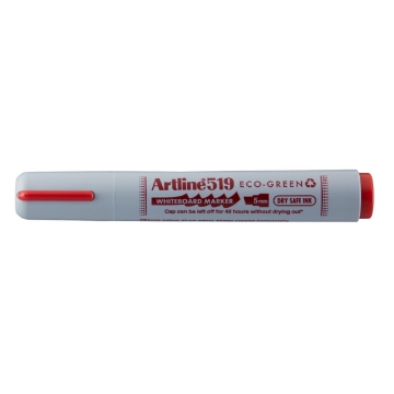 Whiteboardpenna Artline 519 ECO-GREEN Sneddskuren Röd. Whiteboard-penna med skuren spets och 2-5 mm skrivbredd. Plasthylsa i återvunnen plast, alkoholbaserat pigmenttusch utan Xylen, Dry Safe-funktion vilket betyder att den vara utan huv i 48 timmar.Tillverkad av återvunnen plast. Miljömärk med Eco Mark (24112014)